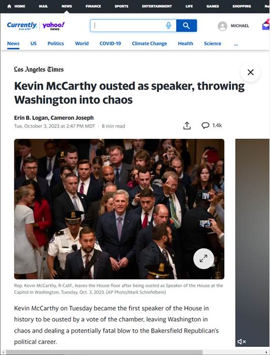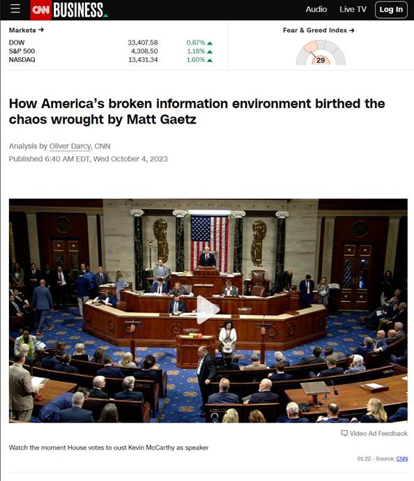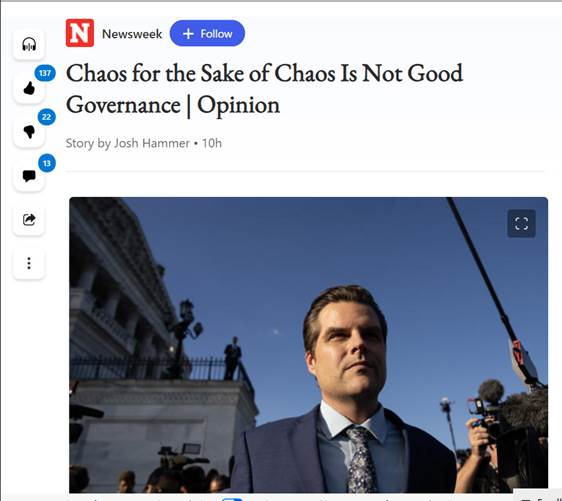 In 2023, the mass media produced a lot of information about the removal of Kevin McCarthy as speaker of the House of Representatives. They all told the same story: The villain was Matt Gaetz, and he was causing “Chaos!” Virtually all mass media stories shouted that same word, “Chaos! Chaos! Chaos!”