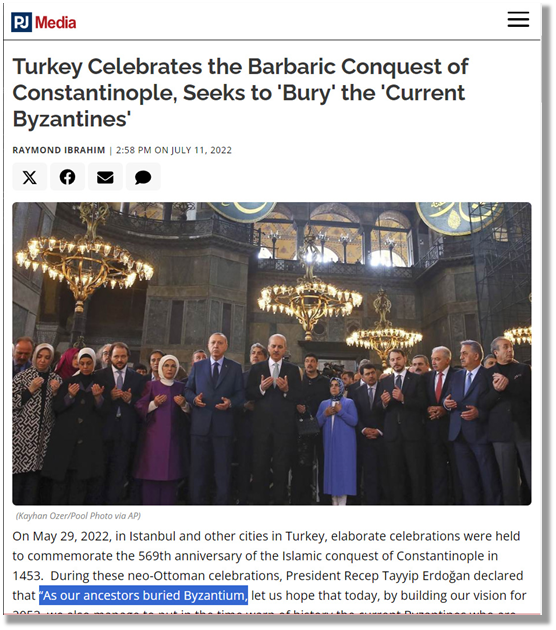In 2022, President Erdogan took the occasion of the anniversary of the rape of Constantinople to promise to “bury” the last vestiges of Christian presence in the region.
