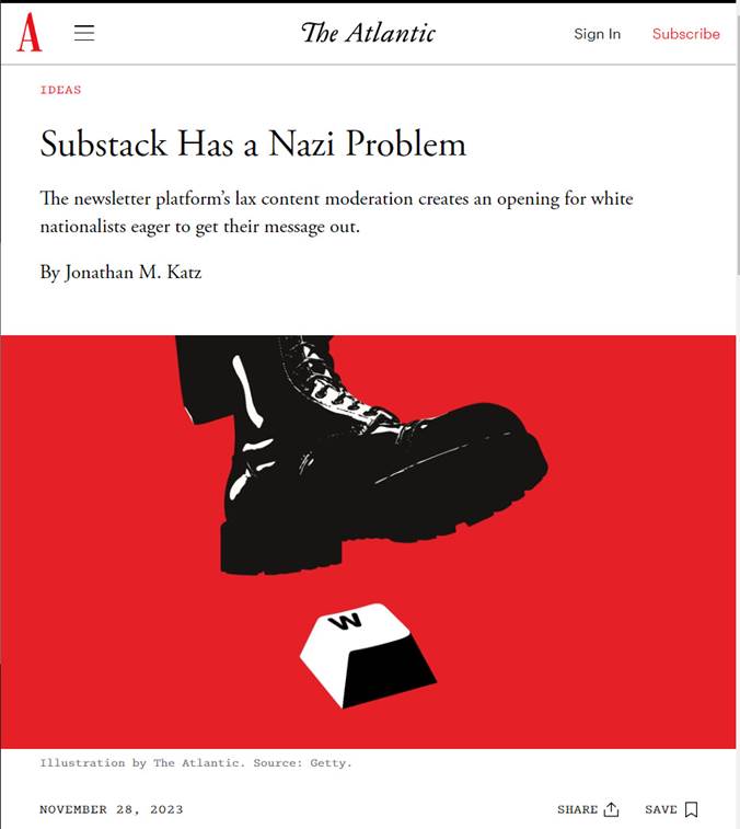 “Over 100 Substack Writers Sign Letter Condemning Site for Hosting Nazi and White Supremacist Newsletters” Forbes